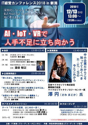 本カンファレンスはITC新潟(新潟県のITコーディネータ38名で構成する任意団体)が主催、昨年に引き続き 3 回目の開催となります。今回のテーマは、人手不足に立ち向かう手段として活用が期待される最新技術「AI・IoT・VRの今とこれから」です。